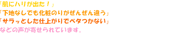 化粧のりがすっごく良かったです!こんなに実感したのは初めてかも…。これ一つで化粧水・乳液・美容液がひとつになった多機能ジェルで、そのままメイクもOKなのだそうです。ですので、これのみ肌に塗ってファンデを使用しました。ジェルがスッとなじみ、ファンデがピタッとくっつきました。これを購入することに決めました!大活躍間違いなしと思っています。