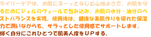 シンプルかつパーフェクト、使用直前にお肌の上で有効成分配合ジェルから濃縮された美容水分が湧き出て、2つの異なる効果が期待でき、お肌の活力に働きかけるリカバリティ効果、洗顔後はこれ1つ、進化を極めたよくばりな化粧水&乳液+美容液+下地の4役コスメは、ヒアルロン酸にグリセリンを併用し、水溶性コラーゲン・植物エキスも配合して保湿力を高めています。